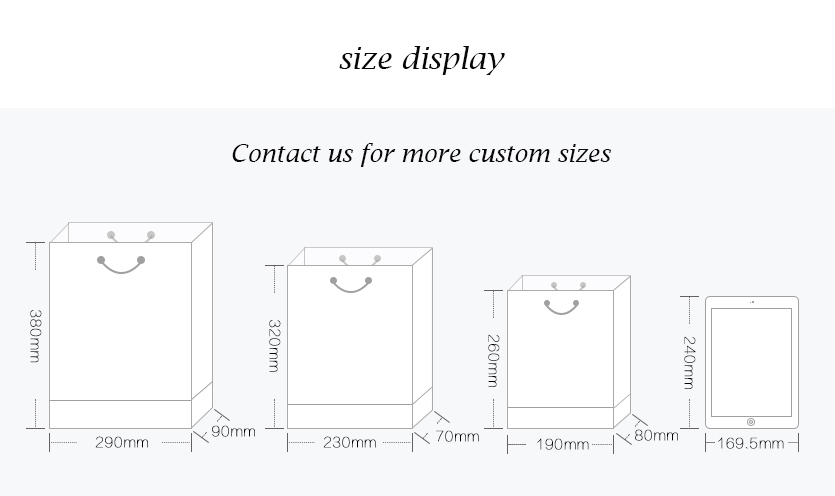 紙袋印品名稱: 白卡紙手提袋 印品材質(zhì): 250g白卡紙(覆亮膜/覆啞膜) 印品尺寸: 自定義 印刷顏色:彩色 后道工序:模切->粘 提繩顏色 白/黑/紅/藍/黃/粉/深棕 印刷周期 5天 |